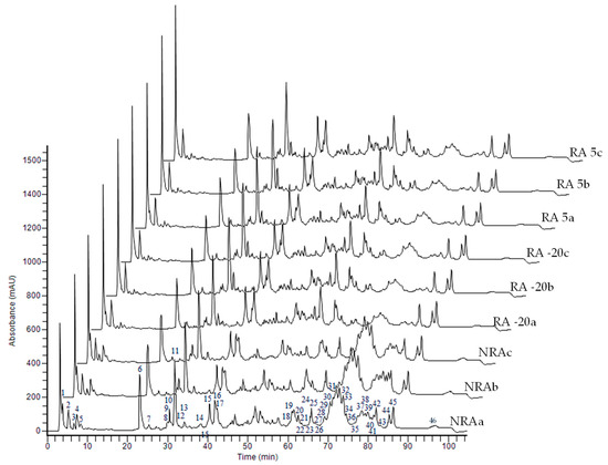 Peptide profiling of cheeses. The numbers in the chromatogram indicate the peaks selected for the PCA. Abbreviations: NRA, cheese with no ripening agent; RA -20, cheese manufactured with L73 freeze-dried cells stored at −20 °C for 6 months as ripening agent; RA 5, cheese manufactured with L73 freeze-dried cells stored at 5 °C for 6 months as ripening agent. The letters a, b, and c in the code of cheeses indicate the independent trials.
