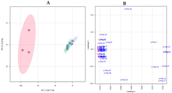 peptide profiling of cheeses. Scores plot (A) and loading plot (B)
