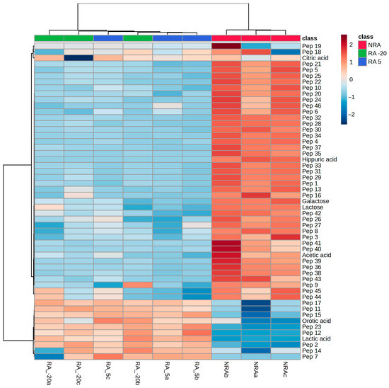 Hierarchical clustering heatmap. Abbreviations: NRA, cheese with no ripening agent; RA -20, cheese manufactured with L73 freeze-dried cells stored at −20 °C for 6 months as ripening agent; RA 5, cheese manufactured with L73 freeze-dried cells stored at 5 °C for 6 months as ripening agent. The letters a, b, and c in the code of cheeses indicate the replicates.