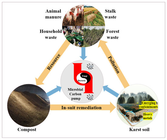 Compost represents a critical approach for the efficient resource utilization of organic solid waste, facilitating the conversion of diverse organic sources into soil conditioners enriched with functional OM. This OM exhibits important environmental functions, such as redox, adsorption, complexation, and chelation, enabling the effective transformation or stabilization of heavy metals and organic contaminants. In calcareous karst ecosystems, the humification of microbial residues, along with their interaction with minerals, can substantially enhance soil organic carbon levels. Consequently, compost demonstrates significant applicability and advantages in karst regions. Building on compost’s “waste-to-resource” potential for soil microecological improvement, this study proposes a technical pathway: “multi-source organic waste, resource-oriented composts, functional organic matter/microorganisms, soil remediation”. This technological model enables the sustainable recycling of organic waste in karst areas and simultaneously facilitates pollution remediation.