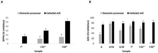 Bioactive properties from pistachio-beverages from Italian (I) and Argentinian (A) varieties made with domestic processor (ν) or colloidal mill (ν) and fermented with Leuc. pseudomesenteroides PD4 (S1) or C. alimentarius PG3 (S2) strains. (A) DPP IV inhibition; (B) ACE-I inhibition. Different letters mean significant differences among samples (p < 0.05). * means significant difference between domestic or colloidal milling.