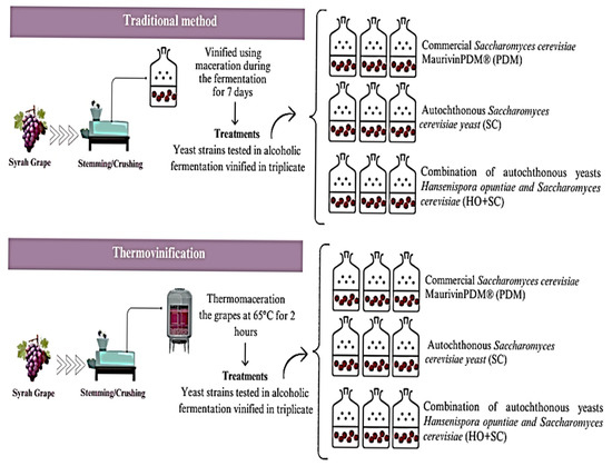 The purpose of TV is to enhance the enrichment of red wine must, particularly by increasing the concentration of phenolic compounds, reducing the microbial load, and promoting the degradation of oxidative enzymes such as polyphenol oxidase [5]. Another great difference of this practice is that the yeast strain used can significantly affect the aroma and flavor of thermovinified wines because of the prevalence of fermentative aromas, and a greater degradation of primary volatile compounds present in the grape berries has been reported with this process compared to that in conventional maceration [6].