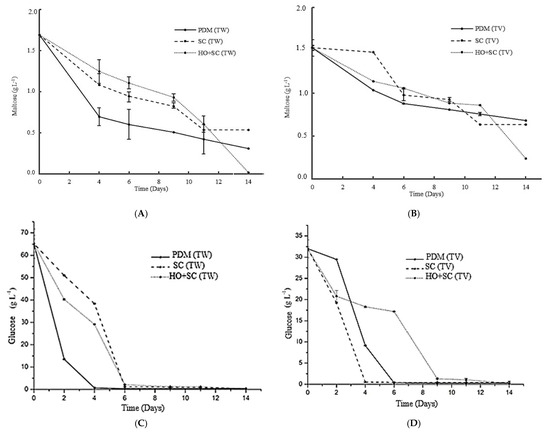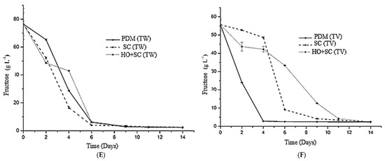 In contrast, in the PDM (TV) treatment, the glucose and fructose were almost completely consumed after 6 days of fermentation, and with SC (TV) after only 4 days. Unlike HO + SC (TV), in the treatment using traditional maceration and the combination of the two autochthonous yeasts, the glucose and fructose levels dropped drastically shortly after 6 days of fermentation. Similar behavior to HO + SC (TW) was observed for the treatment wherein traditional maceration was applied using only the autochthonous yeast S. cerevisiae (SC (TW)). In SC (TV), glucose was preferentially degraded by yeasts, while the fructose level drastically decreased only from the 9th day of fermentation.