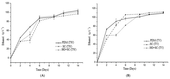 The treatments with TV yield high ethanol formation values as early as the 2nd day of the fermentation (Figure 3), especially with the PDM yeast, which reached 73.27 g/L, followed by the combination of autochthonous yeasts HO + SC with 59.53 g/L and the autochthonous SC with an ethanol concentration of 51.09 g/L. For the treatments with TW, values above 59.3 g/L were reached only after 4 days of fermentation. At the end of fermentation, the highest ethanol concentration was observed in PDM (TV) (117.37 g/L), and the lowest was found with the same yeast (PDM) in the TW treatment (110.67 g/L). Geffroy et al. [30] also reported higher levels of ethanol in the thermovinified wines when compared to those made using the TW method. The authors found values ranging from 112 to 153 g/L of alcohol for TW and from 125 to 156 g/L for the thermovinified wines.