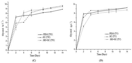 Glycerol is, after ethanol, the most important alcohol in wine, typically found in quantities ranging from 5 to 10 g/L [34]. Regarding the formation of this alcohol in the tested treatments, all treatments showed concentrations > 4 g/L on the 2nd day of fermentation, ranging from 4.99 (HO + SC-TW) to 7.87 g/L (PDM-TV). However, at the end of fermentation, the must with the highest glycerol concentration was the one fermented by the autochthonous SC yeast using TW (9.70 g/L).