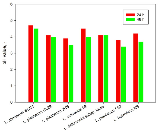 In this study, 7 Lactobacillus strains with human or dairy origin (Table 2) from the microbial collection (IMicB) of the laboratory “Lactic acid bacteria and Probiotics” of the Stefan Angeloff Institute of Microbiology (IMicB), BAS, were preselected. All strains were stored at −20 °C in MRS (De Man, Rogosa, Sharp) medium, pH 6.5, supplemented with 20% v/v glycerol (Difco, Heidelberg, Germany). Before the assay, all strains were pre-cultured twice in MRS broth (HiMedia, Mumbai, India) for 24 and 48 h, respectively, with 2% v/v inoculum. Activated exponential-phase cultures of both strains were used as the 10% v/v inoculum for the fermentation process.