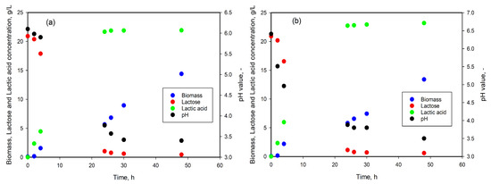 - Fu, W.; Mathews, A.P. Lactic Acid Production from Lactose by Lactobacillus Plantarum: Kinetic Model and Effects of pH, Substrate, and Oxygen. Biochem. Eng. J. 1999, 3, 163–170. [Google Scholar] [CrossRef]