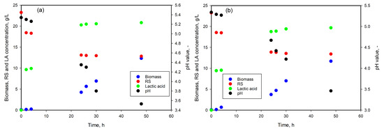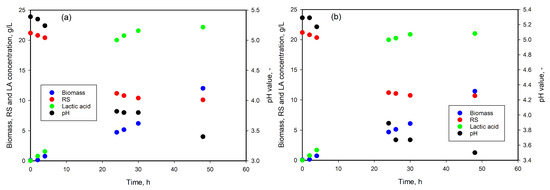 Time course of substrate consumption, biomass growth, LA accumulation, and pH drop from SCG hydrolysate with L. plantarum f53 (a) and L. plantarum 2HS (b).