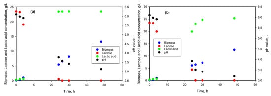 Time course of substrate consumption, biomass growth, LA accumulation, and pH drop from lactose with L. plantarum f53 (a) and L. plantarum 2HS (b).