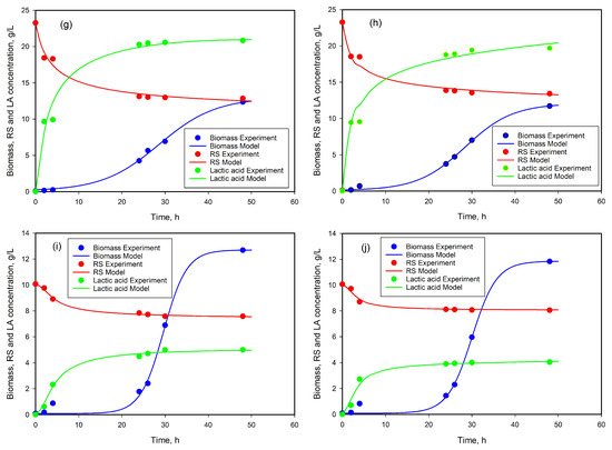 Concerning the modeling of LA production from different substrates, data for lactose and whey are available, while these for DDGS are scarce and for SCG are missing. Some data are summarized in Table 4.