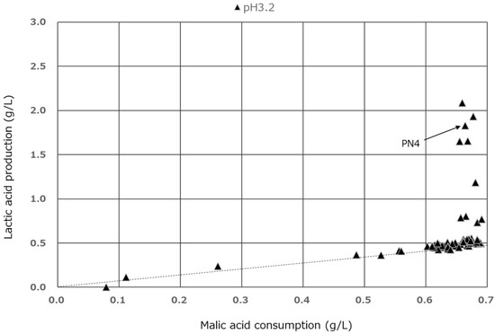 Relationship between malic acid consumption and lactic acid production by the isolated O. oeni strains in this study in BM without reducing sugar. The dotted line represents the expected 1:1 molar ratio between malic acid consumption and lactic acid production.
