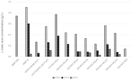 L-malic acid concentration on day 7 post-inoculation in modified BM at different pH levels. 17CHKO-ML3, 18CHKO-MLa20, 18CHKO-MLb3, 18CHKO-MLb5, 18CHKO-MLb6, 18CHKO-MLb11, and 18CHKO-MLb14 strains isolated from wine and 19CHKO-GR4 strain isolated from grapes were used. Commercial starters MBR PN4, MBR 31, VINIFLORA CH11, and PreAC were used as controls. Initial L-malic acid concentration in the culture medium was 1 g/L.