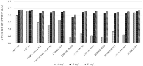 L-malic acid concentration on day 7 after inoculation into the modified BM (pH 3.2) with varying SO2 concentrations (10, 25, and 50 mg/L). Initial L-malic acid concentration and strains used are consistent with those in Figure 2.