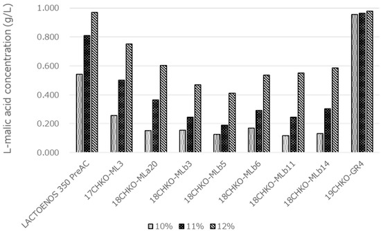 L-malic acid concentration on day 7 after inoculation into modified BM (pH 3.2) under different ethanol concentrations (10, 11, and 12% v/v). The commercial starter PreAC served as a control. Initial L-malic acid concentration was consistent with Figure 2.