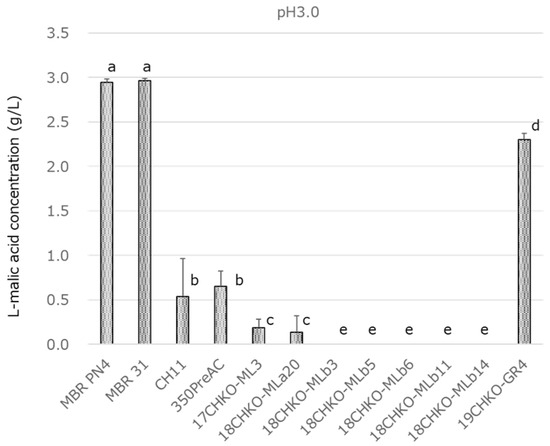 L-malic acid degradation by strains in synthetic Koshu model wine medium (pH 3.0, Alc. 13%). Different letters indicate statistically significant differences between variables. Values with the same letter are not statistically significant (p < 0.05).