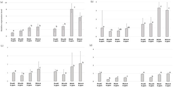 Evaluation of the relative expression of mleA and cfa on days 2 and 7 of MLF at different sulfite concentrations. (a) day 2, mleA; (b) day 2, cfa; (c) day 7, mleA; (d) day 7, cfa expression levels. Values with the same letter are not statistically significant (p < 0.05).