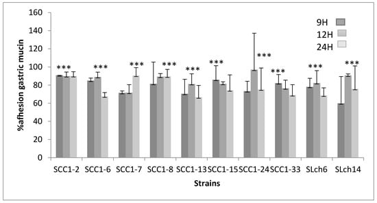 Adhesion to gastric mucin at three different stages of cells’ growth: in the exponential phase, early stationary phase, and stationary phase. The results are expressed as means ± standard deviation from three independent experiments. *** p < 0.001.