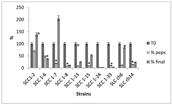 Resistance of 10 LAB strains to simulated in vitro digestion. T0 corresponds to the initial bacterial count before digestion; Peps corresponds to the bacterial count after exposure to simulated gastric fluid (pepsin treatment); Final corresponds to the bacterial count after exposure to simulated intestinal fluid. * p < 0.05.
