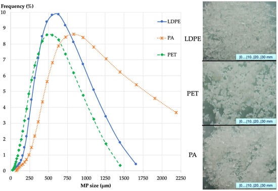 The MP size distributions are presented in Figure 1 along with a stereomicroscope (EZ4, Leica, Leica Microsystems GmbHm Wetzlar, Germany) picture for each polymer.