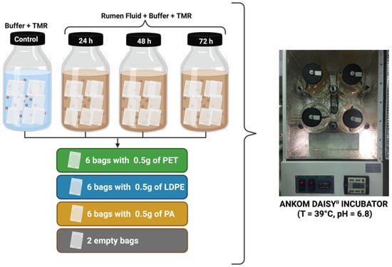 In brief, each jar (1, 2, 3, and 4) was loaded with LDPE, PET, and PA MP samples, each previously weighed (500 mg) and sealed in F57 ANKOM bags (25 µm pore size; Ankom Technology Corporation Fairport, Macedon, NY, USA) using a thermos-sealer. Each jar contained 6 replicate bags for each polymer and 2 empty bags totaling 20 bags per jar. Jars 1, 2, and 3 were filled with buffered rumen fluid (1600 mL of buffer solution and 400 mL of rumen fluid) and 20 g of dried and 2 mm ground diet provided to the rumen fluid donor bulls (TMR). Jar 4, intended to assess potential MP loss, contained only the buffer solution (1600 mL). Before the incubation, each jar was saturated with CO2 to maintain anaerobic conditions. The bags were removed after 24 h of incubation from jar 1, after 48 h from jar 2, and after 72 h of incubation from jar 3. From jar 4, which contained 6 bags of each polymer type and only the buffer solution, two bags per polymer were removed at 24, 48, and 72 h of incubation to assess potential MP weight loss. At the end of each incubation period, both bags with MPs and empty bags were removed and washed in cold tap water (15 min) to clean them from buffered ruminal fluid residues. After washing, samples were dried at 60 °C in a forced-air oven for at least 6 h. The experimental design is illustrated in Figure 2.