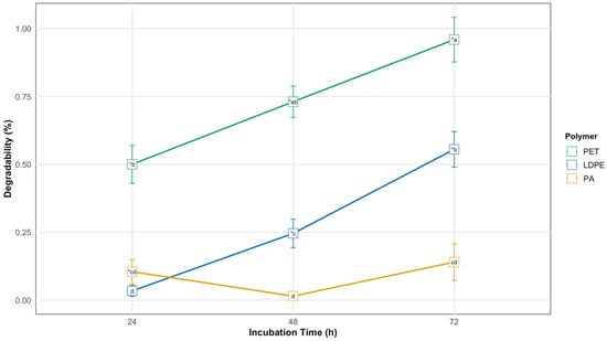Ruminal degradability (%) of PET (polyethylene terephthalate), LDPE (low-density polyethylene), and PA (polyamide) polymers during in vitro incubation with buffered rumen fluid (incubation times: 24, 48, and 72 h). To test whether degradability was significantly greater than 0%, a Wilcoxon test was applied (* = p-value < 0.05). To compare degradability differences among the three polymers across incubation times, a Kruskal–Wallis test was applied (a–d = p-value < 0.05).