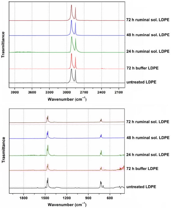 Figure 5 presents the FT-IR spectra of LDPE MP residues recovered after 24, 48, and 72 h of incubation in ruminal fluid, along with spectra of LDPE MP incubated in the buffer for 72 h and untreated LDPE MP. The upper portion of Figure 5 illustrates the spectral region between 4000 and 2000 cm−1, while the lower portion covers the 2000–400 cm−1 range. Additionally, the 24 h sample was included to assess early indications of degradation trends, if there were any.