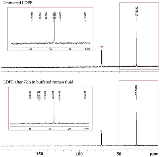 The results obtained from the FT-IR analysis were further confirmed by 13C NMR spectroscopy, which has been used to investigate the microstructure of the polymer chains. The 13C NMR data showed that no significant alterations occurred in the polymer microstructure following the incubation in rumen fluid. As an illustrative example, in Figure 6, the spectra of untreated and degraded LDPE MP residues after 72 h of incubation are compared.