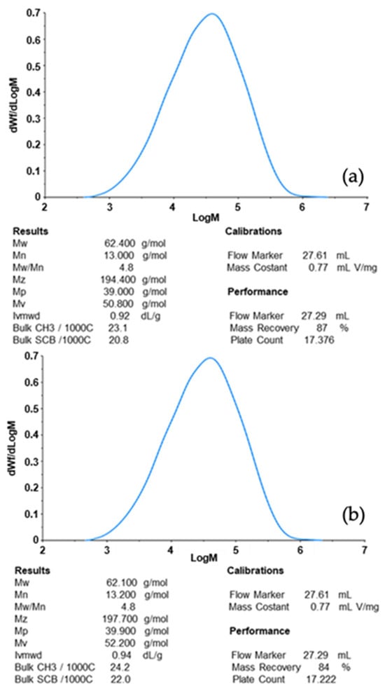 Size Exclusion Chromatography (GPC/SEC) Analysis: Molecular weight distribution and dispersity were determined by gel permeation chromatography (GPC) at 140 °C using 1,2,4-trichlorobenzene as the solvent. Polystyrene standards with narrow molecular weight distributions were used for calibration. Measurements were conducted on a PL GPC 210 system with four 4 PL-Gel Mixed A Columns, a refractive index detector, and a DM 400 data manager (Viscotek, Church Stretton, Shropshire, UK).