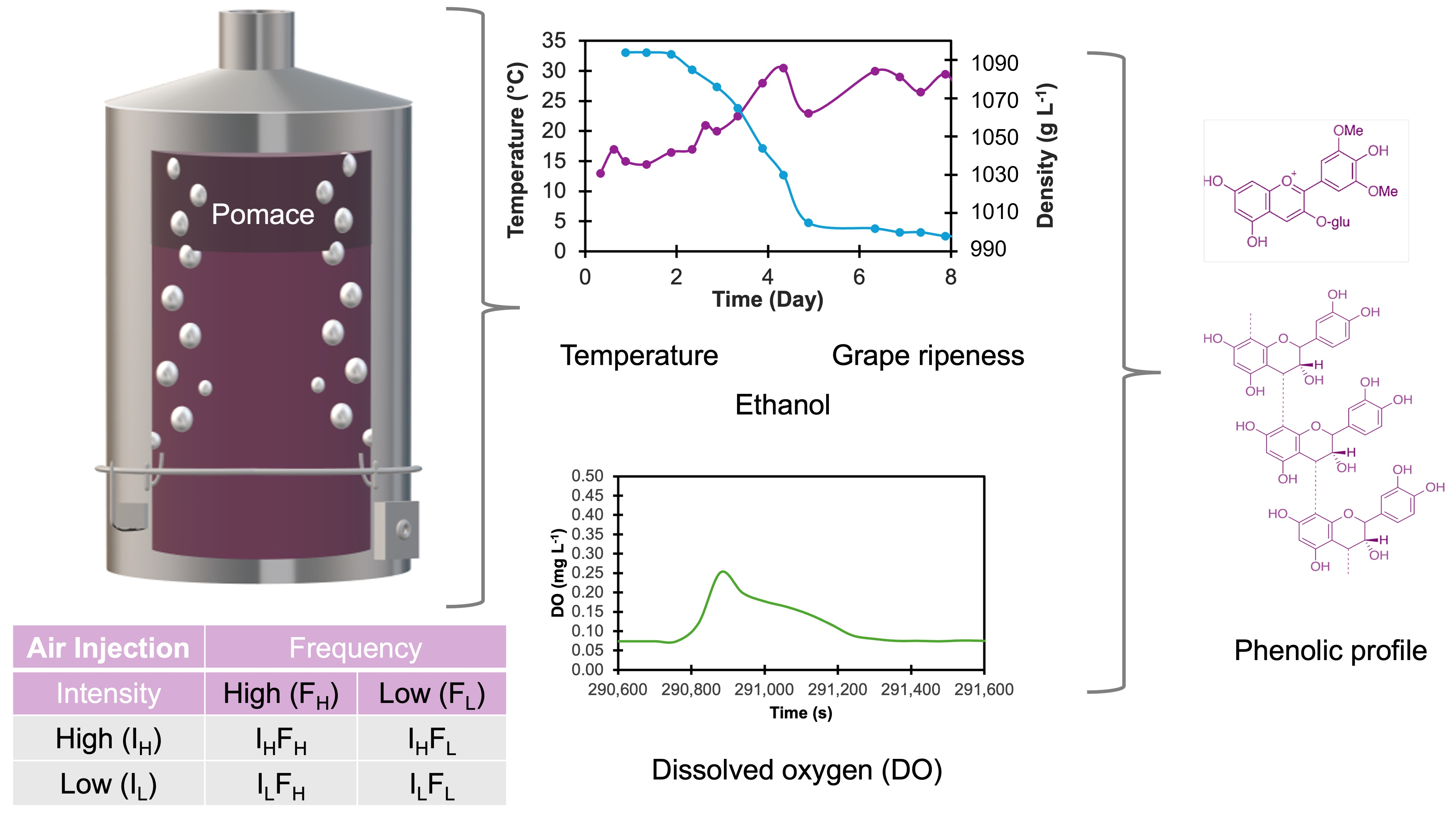 - Lerno, L.; Reichwage, M.; Ponangi, R.; Hearne, L.; Block, D.E.; Oberholster, A. Effects of Cap and Overall Fermentation Temperature on Phenolic Extraction in Cabernet Sauvignon Fermentations. Am. J. Enol. Vitic. 2015, 66, 444–453. [Google Scholar] [CrossRef]