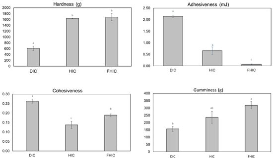 Textural properties of DIC, HIC, and FHIC. If the letters (a–c) used as superscripts are the same, there is no difference between samples produced with different formulations (p > 0.05).