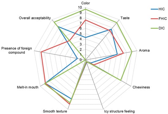 A trained panel (n = 13) evaluated three ice cream formulations in two sessions: (1) Plant-based ice cream: Hazelnut cake (HIC) and fermented hazelnut cake (FHIC) variants; (2) Dairy-based control ice cream (DIC): Traditional formulation (cow’s milk cream, sugar, and salep). The panelists frequently associated DIC with “traditional childhood ice cream” due to its familiar flavor and texture. It received the highest scores for color (9.64), taste (9.26), aroma (8.99), and chewy texture (7.75) (Figure 3). Its melt-in-mouth and smoothness were comparable to plant-based variants. No negative comments were reported for HIC, and the presence of foreign compound/flavor detection was minimal (1.59). Conversely, FHIC was characterized as “very interesting”, yet polarizing, with certain panelists expressing that they “would find it challenging to consume regularly.” Among all samples, the presence of foreign compound/flavor (8.66) detection was highest for FHIC, while it was zero for DIC. The overall acceptability of the ice cream products is ranked as follows: DIC > HIC > FHIC (based on panelists’ rankings).