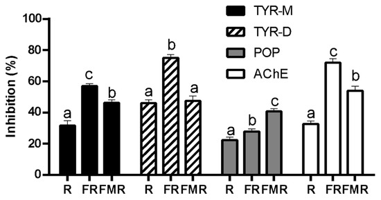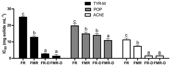 IC50 values of acetylcholinesterase (AChE), tyrosinase (TYR), and prolyl oligopeptidase (POP) inhibitory activity of the fermented products (FR and FMR) and their dialysates (FR-D and FMR-D) obtained after digestion. Different letters in a column for the same enzyme mean significant differences among samples (p < 0.05). TYR-M: monophenolase activity.