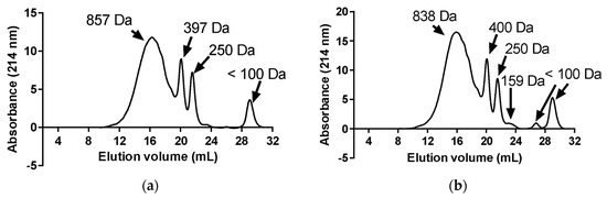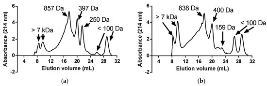 FPLC gel filtration profile of dialysates obtained from FR (a) and FMR (b) after gastrointestinal digestion.