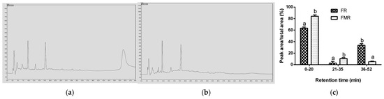 RT-HPLC profile of FR (a) and FMR (b), and proportion of peptide area with respect to total area obtained from RT-HPLC profile of FR and FMR (c). Different letters in a column mean significant differences between samples (p < 0.05).
