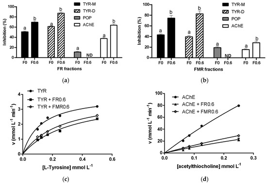 Acetylcholinesterase (AChE), tyrosinase (TYR), and prolyl oligopeptidase (POP) inhibitory activity of fractions obtained after anion exchange chromatography from FR (a) and FMR (b) evaluated at 0.5 mol peptide L−1, Michaelis–Menten plots of TYR enzyme in the absence (●) or presence of FMR0.6 (◇) or FR0.6 (■) (c), and Michaelis–Menten plots of AChE enzyme in the absence (●) or presence of FMR0.6 (◇) or FR0.6 (■) (d). Different letters in a column mean significant differences between samples (p < 0.05).