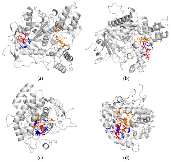 Interaction between GFD peptide and AChE enzyme (a), interaction between AADQP peptide and AChE enzyme (b), interaction between GFD peptide and TYR enzyme (c), and interaction between AADQP peptide and TYR enzyme (d). Red color: GFD or AADQP peptide. Blue color: enzyme interaction zone with peptides. Orange color: active site of AChE and TYR enzymes. AS: active site.