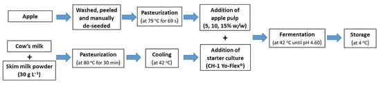 Pasteurized and homogenized cow’s milk (Olympos, Greece; composition per 100 mL: fat 3.7 g; sugar 4.7 g; protein 3.4 g) and skim milk powder (Regilait, France; composition per 100 g: fat 0.8 g; sugar 52 g; protein 36 g) were employed in the present study. Apple samples from the following cultivars, Gala, Starking, Jonagold, Golden, and Granny Smith, cultivated in Greece, were purchased from a local store. The starter culture (Streptococcus thermophilus and Lactobacillus delbrueckii subsp. bulgaricus) used for yogurt production was the commercial CH-1 (YoFlex) (Chr. Hansen, Hørsholm, Denmark).
