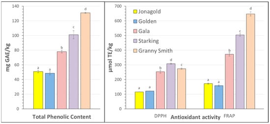 Apples are among the most widely consumed fruits globally because they are available year-round, either as fresh or processed products, versatile, and inexpensive. Furthermore, apples are very nutritious, containing bioactive compounds, and are an excellent source of carbohydrates, minerals, dietary fiber, and phenolics [4]. Moreover, the consumption of apples and their products has been associated with numerous health benefits and increased life expectancy [5,6,7]. It is well known that variations occur in antioxidant activity and total phenolic content among apple cultivars and fruit tissues [4,5,6,7,8].