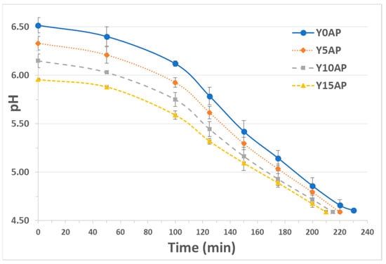 Acidification kinetics during yogurt production (Y0AP: yogurt without apple pulp; Y5AP, Y10AP, and Y15AP: yogurts with apple pulp 5, 10, and 15% w/w, respectively).