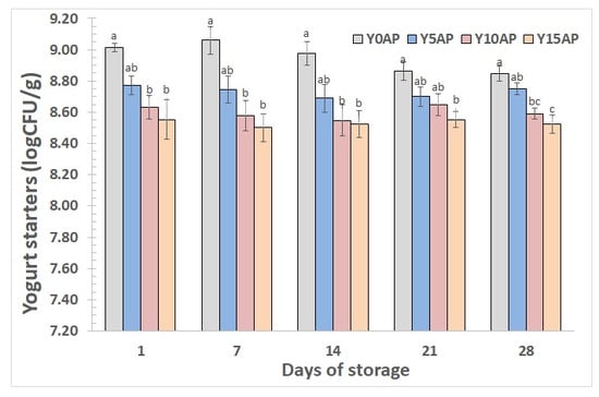 Viability of yogurt starters during storage (Y0AP: yogurt without apple pulp; Y5AP, Y10AP, and Y15AP: yogurts with apple pulp 5, 10, and 15% w/w, respectively. a–c Different lowercase letters in the columns, on the same day of storage, indicate significant differences (p < 0.05)).