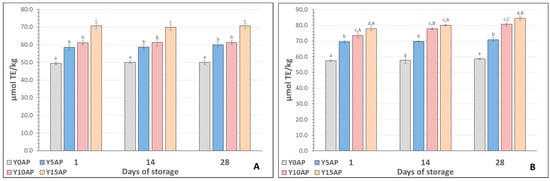 Antioxidant activity of yogurts measured with the DPPH (A) and FRAP (B) methods (Y0AP: yogurt without apple pulp; Y5AP, Y10AP, and Y15AP: yogurts with apple pulp 5, 10, and 15% w/w, respectively; TE: Trolox equivalents. a–d Different lowercase letters in the columns, on the same day of analysis, indicate significant differences—effect of apple pulp (p < 0.05). A–C Different uppercase letters in the columns, at the same sample, indicate significant differences—effect of storage (p < 0.05).