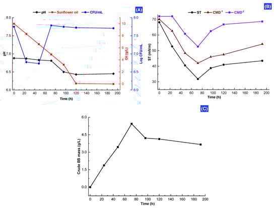 The kinetic profile of BS production is shown in Figure 1A–C. Figure 1A illustrates bacterial growth, oil consumption, and medium pH throughout the experiment. The pH of the production medium decreased from 6.9 to 6.4 after 192 h (Figure 1A). A reduction in the viable cell population was observed between 24 and 48 h. Sunflower oil was completely consumed after 120 h of cultivation.