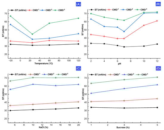 The stability of the compound was evaluated by monitoring ST under different conditions of temperature, pH, salinity, and sugar concentration (Figure 2A–D).