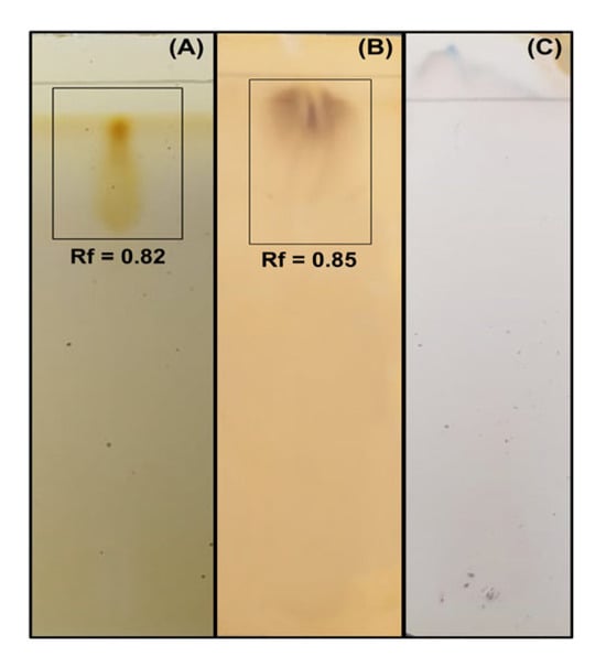 TLC analysis provided preliminary insights into the chemical composition of the BS. When the plate was incubated in a chamber saturated with iodine vapor (Figure 3A), a yellow spot with an Rf value of 0.82 was observed, indicating the presence of lipids. The presence of sugars was confirmed by a dark spot with an Rf value of 0.85 after staining with α-naphthol solution (Figure 3B). No spots were detected after staining with ninhydrin solution (Figure 3C), suggesting the absence of peptides or amino acids.
