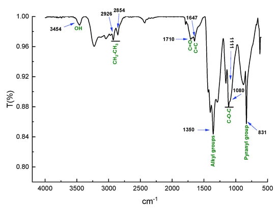 The band observed at 1647 cm−1 corresponds to C=C stretching vibrations, indicating the presence of conjugated carbon–carbon double bonds. The intense band at 1350 cm−1 suggests the presence of alkyl groups, specifically indicating bonds between hydroxyl groups and carbon atoms in the glycosidic moiety [25]. The absorption bands at 1111 cm−1 and 1080 cm−1 were assigned to symmetric and asymmetric C–O–C stretching vibrations, respectively. The presence of carbohydrate rings was further supported by the band observed at 831 cm−1 [26].