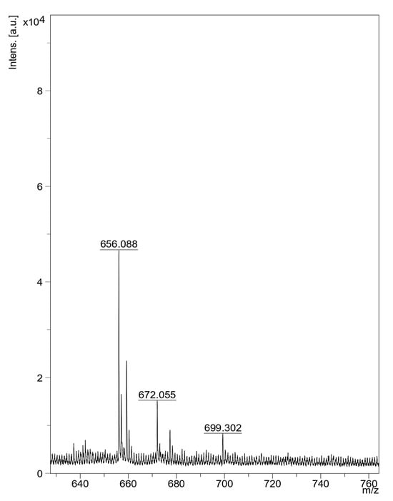 Mass spectrometric analysis of the pBS extract (Figure 5) revealed the presence of sodium [M + Na+] (m/z 656 and 699) and potassium [M + K+] (m/z 672) adducts, which are commonly observed in samples containing carbohydrate derivatives [27].