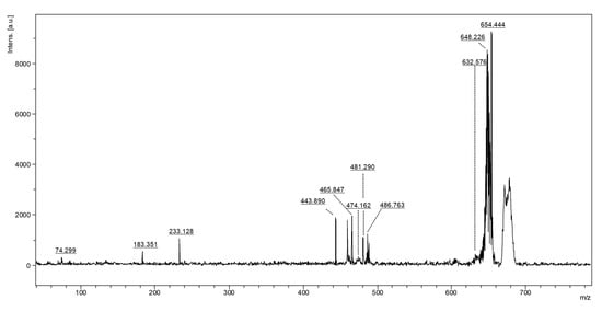 In the mass spectrometry technique, the selectivity of the ionization process favors the formation of ions from specific regions of the molecule, while others remain neutral. These neutral fragments can be indirectly detected by analyzing the mass differences between the observed peaks. In our analyses, non-ionized mass fractions of 180 Da were identified, as evidenced by the difference between the peaks at m/z 654 and m/z 474 (654 − 474 = 180), which corresponds to the molar mass of a glucose unit.