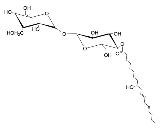 The third pseudomolecular ion at m/z 699.302 [M + Na+], present at a lower concentration in the sample, also corresponds to a TL-type BS, differing mainly in side-chain composition, which includes two fatty acids with C4 and C18 chains. The proposed structure of this homologue is shown in the Supplementary Material (Figure S1).
