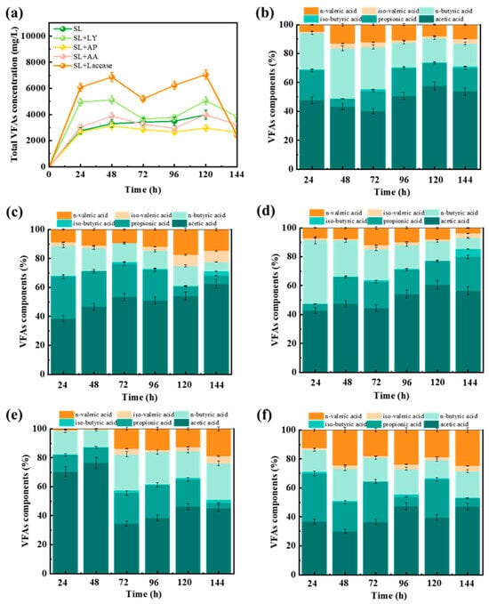 (a) Total VFA concentration and (b–f) the fraction of individual VFAs from the different pretreatment groups: (b) SL; (c) SL + LY; (d) SL + AA; (e) SL + AP; and (f) SL + LA.