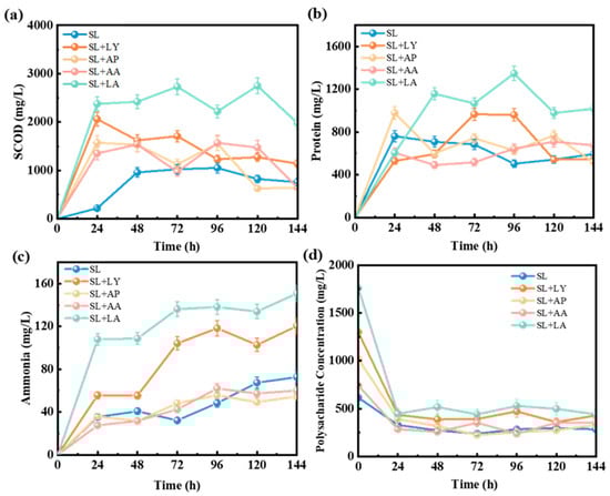 As shown in Figure 2b–d, the SL + LA group exhibited the highest soluble polysaccharide concentration, with the SL + LY group ranking second. The contents of protein and carbohydrate in the SL + LA and SL + LY groups showed significantly higher levels compared to other groups, demonstrating that this pretreatment method enhanced the release of organic matter and supplied abundant substrates for VFA production. At the same time, the content of ammonia nitrogen in the two groups was also relatively high and showed an upward trend, demonstrating that protein was used to convert more acid. The findings clarified why the two groups achieved the highest VFA production. Additionally, it was also found that the sludge solubility of the SL + AA and SL + AP groups was relatively poor. It was well known that AA could decompose starch into small molecules, and AP could decompose proteins into polypeptides, which had the effect of promoting more powerful growth of the bacteria and achieved the effect of improving the ability of saccharification and fermentation [,]. However, the lower VFAs from these two pretreatment groups were due to the inability to effectively crack sludge, resulting in limited organic matter for microbial synthesis of VFAs.